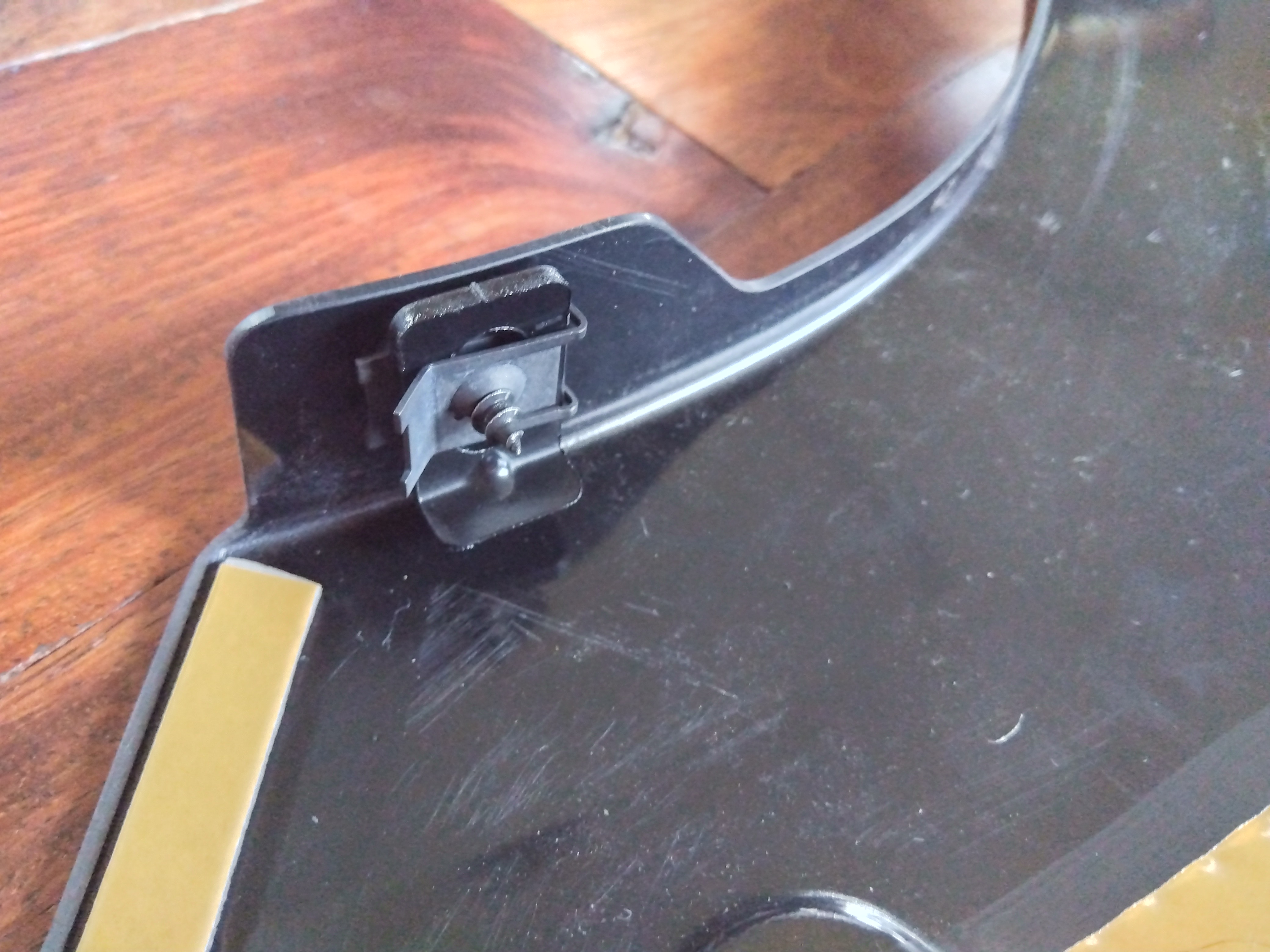 上部は、両面テープで接着するようになっているので、テープを少しはがして部品の外側に出しておき、位置が決まったところでクリップを押し込んで固定する。